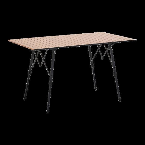 Et stabilt, lett aluminiumsbord som tar liten plass når det er slått sammen. Kan brukes som spisebord eller salongbord. Topplate laget av aluminiumslameller (55 x 11 mm). Inkludert oppbevaringspose.